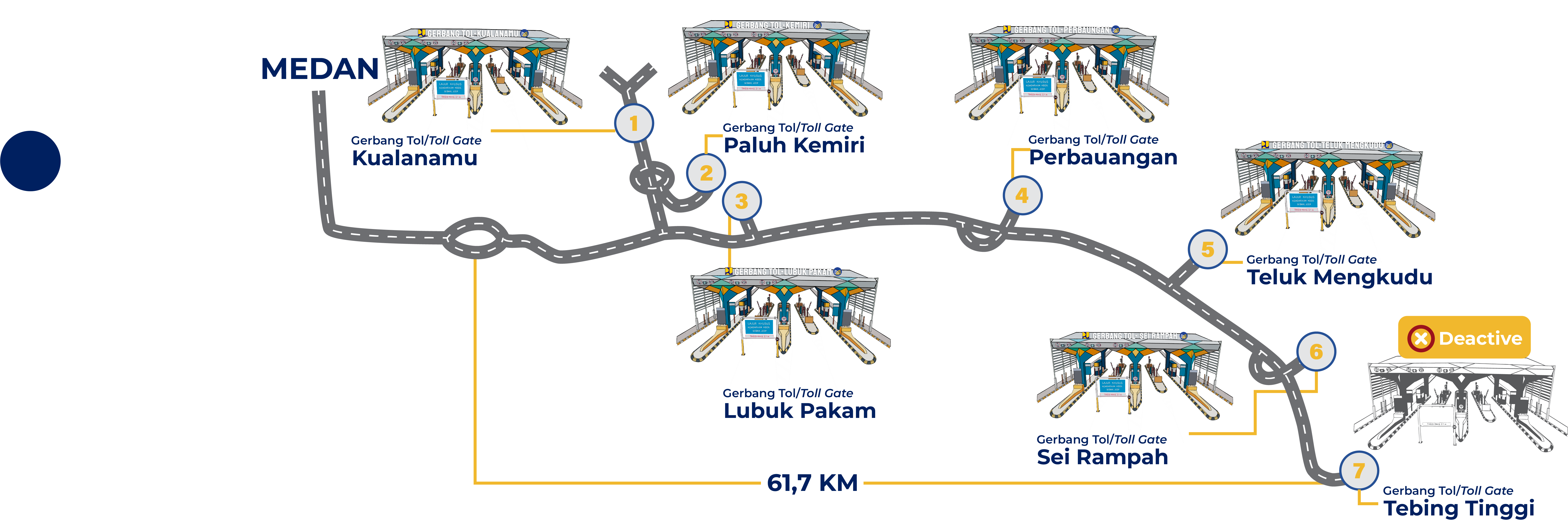 Pembangunan jalan tol jalan tol sepanjang 61,70 km dibagi menjadi 7 seksi. Seksi 1 dan 2 ruas (Medan-Parbarakan-Kualanamu) sepanjang 17,80 km, pekerjaan konstruksi dilaksanakan oleh pemerintah menggunakan dana Anggaran Pendapatan dan Belanja Negara (APBN) dan setelah konstruksi selesai dioperasikan oleh PT Jasamarga Kualanamu Tol. Seksi 3 sampai dengan Seksi 7 (Parbarakan-TebingTinggi) sepanjang 43,90 km dibangun oleh PT Jasamarga Kualanamu Tol dengan menggunakan dana pinjaman sebesar 70% dan equity 30%. Selengkapnya, 7 (tujuh) seksi ruas Jalan tol Medan - Kualanamu - Tebing tinggi terdiri dari :